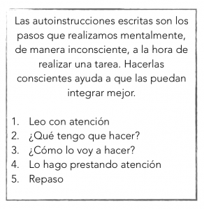Primero, leeremos con ellos la tarea a realizar. Una vez entendida, dejaremos que la hagan solos y podremos repasarla después. Si todavía requieren más acompañamiento, ofreceremos autoinstrucciones que los ayuden a entender el mecanismo y la estructura de la tarea.